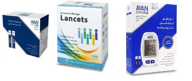 دستگاه تست قندخون آوان همراه با 10 عدد نوار تست قندخون + نوار آوان بسته 50 عددی همراه با بسته 100 عددی سوزن تست قند خون (لنست)